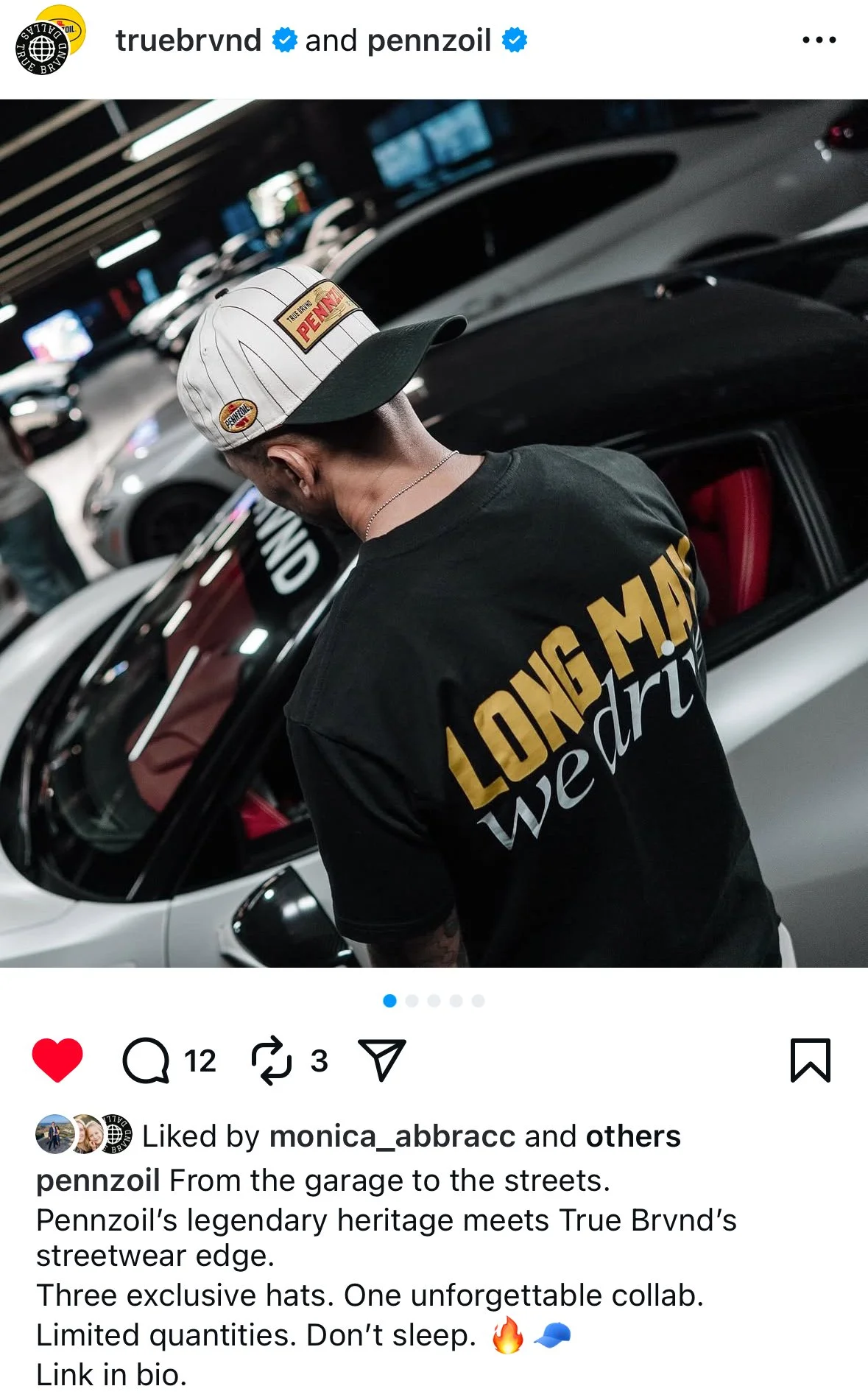 Built as a limited-time drop, the custom hat collaboration paired Pennzoil’s performance heritage with True Brvnd’s culture-first approach. And we let social do what it does best, teasing the drop just enough to build buzz.